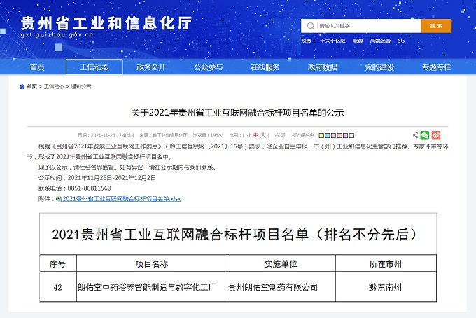 2021年11月26日,由貴州朗佑堂制藥有限公司實(shí)施的朗佑堂中藥浴養(yǎng)智能制造與數(shù)字化工廠項(xiàng)目被列為2021貴州省工業(yè)互聯(lián)網(wǎng)融合標(biāo)桿項(xiàng)目。根據(jù)公示名單,貴州省黔東南州只有3個(gè)項(xiàng)目被列為標(biāo)桿項(xiàng)目,而朗佑堂中藥浴養(yǎng)智能制造與數(shù)字化工廠項(xiàng)目是其中一個(gè)。
